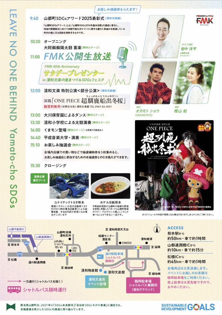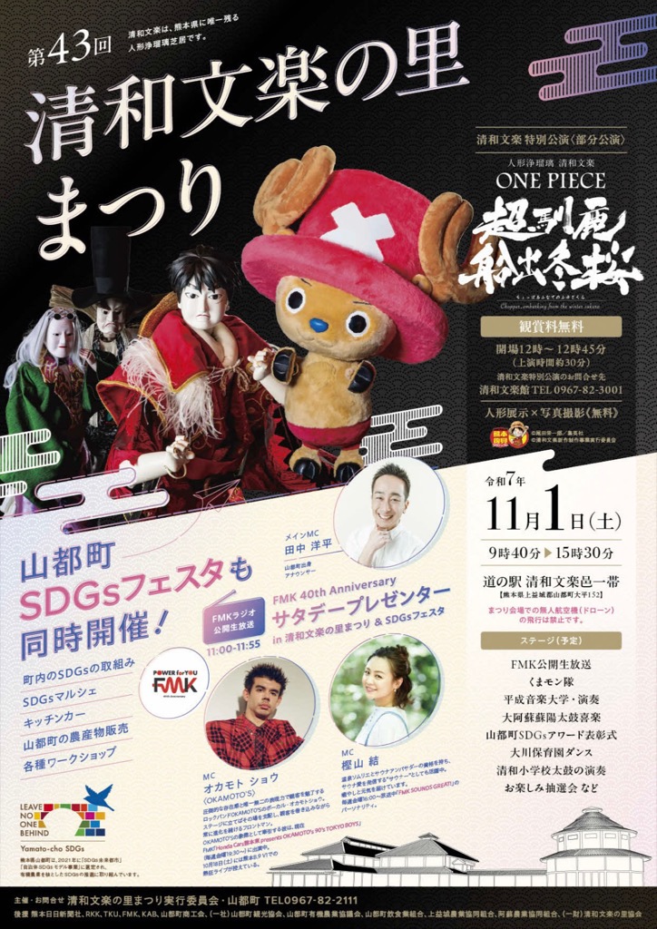 熊本県の重要無形文化財「清和文楽人形芝居」の特別公演、人形浄瑠璃清和文楽ONE PIECE「超馴鹿船出冬桜(ちょっぱあふなでのふゆざくら)」 の一部を無料公演いたします。また、今年40周年を迎えるFMKラジオの公開生放送などイベント盛りだくさんです!皆さまのご来場をお待ちしております!